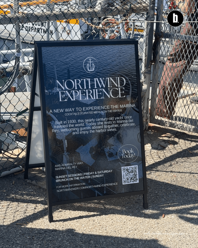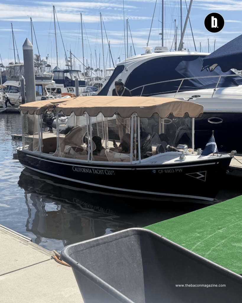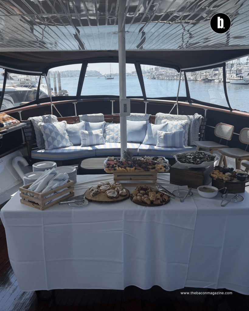 The Northwind — a 130-foot classic yacht commissioned in 1930, beautifully restored with brass fixtures, historic details, and sweeping coastal views, and docked at the California Yacht Club in Marina del Rey — set the scene. Champagne flowed as servers in uniform moved through the crowd with food and drinks throughout the afternoon. This was not a self-serve situation. This was a fully produced experience. A live DJ, Bobbie Lee, kept the energy exactly right from arrival to departure. And then there was the smaller vessel that took guests out for an exhilarating 10-minute ride beyond the dock — open water, wind, and a moment that reminded everyone exactly where they were.